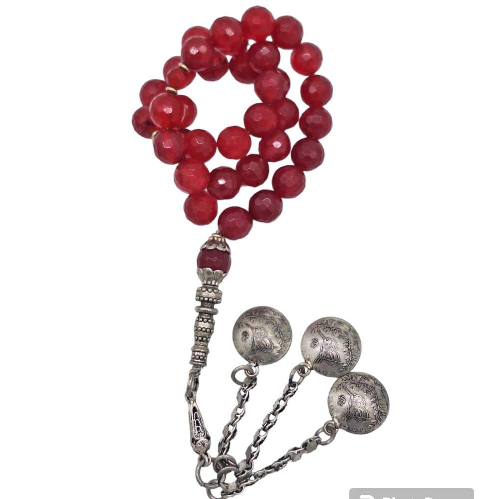 مسبحة ياقوت افريقي طبيعي الوزن : 47 قرام العدد 35 خرزة المقاس 9 ملي الشكل دائري قصة ياقوتية كركوشة فضة وزن 12 قرام